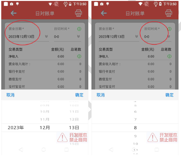 查询路径为:进入主菜单 - 日对账单,选择 营业日期、日切时间,查询日对账单汇总数据并进行汇总票据打印